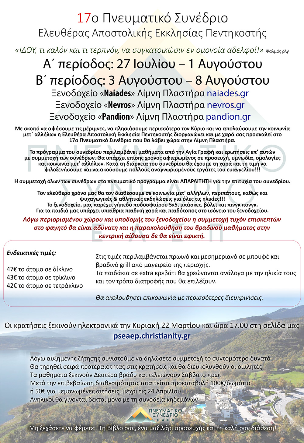 Αυτό άρεσε πρώτα στον Κύριο και μετά στους υπόλοιπους αδερφούς και έτσι ο αδ. Δημήτρης Κοτσώνης ανέλαβε να βρει έναν κατάλληλο χώρο να διοργανώσει την εκδήλωση αυτή. Αποφασίσαμε να αποφύγουμε τη θάλασσα και τη κοσμοσυρροή και να πάμε όλοι μαζί σε ένα ήσυχο μέρος κάποιου βουνού της πατρίδας μας. Και κάπως έτσι ξεκίνησε το Πρώτο Πνευματικό Συνέδριο...